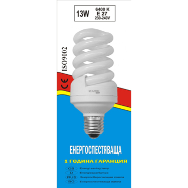 Енергоспестяваща лампа - мини 3U Мощност - 13W Цветна темп. - 6400 К студена светлина Цокъл - Е27 Живот - 8000 часа. Гаранция: една година
